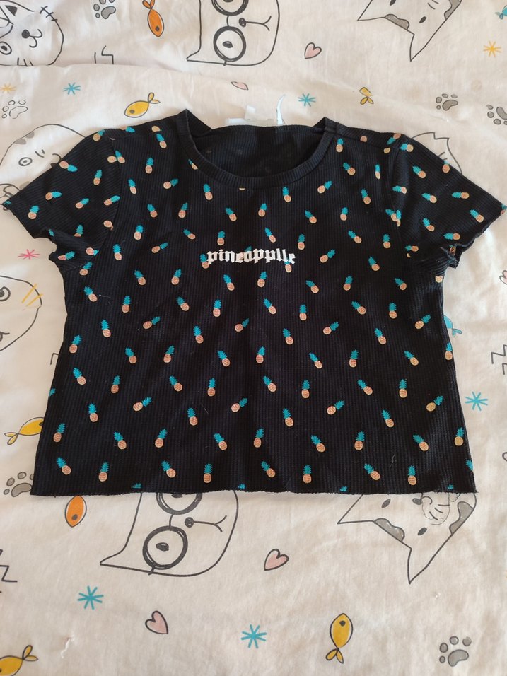 Siyah kız tişörtü, ananas desenli, kısa kollu ve düğme detaylı. Rahat kesimi ve yuvarlak yakası ile sokak stiline uygun sentetik kumaş.