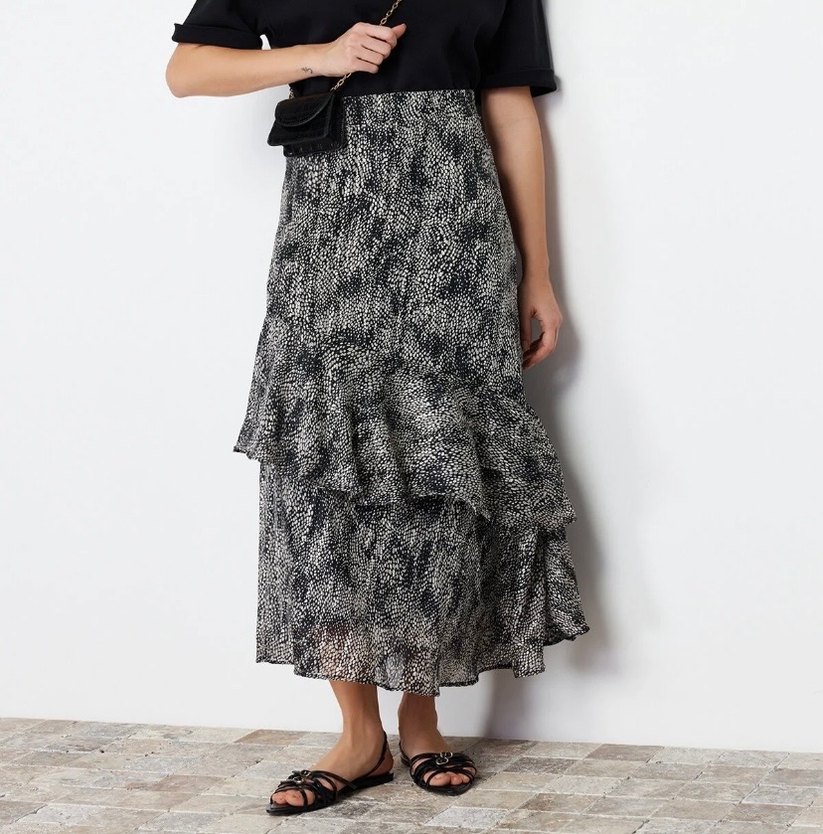Animal desenli siyah uzun volanlı etek, rahat kesimi ve yumuşak sentetik kumaşıyla günlük kullanıma uygundur.