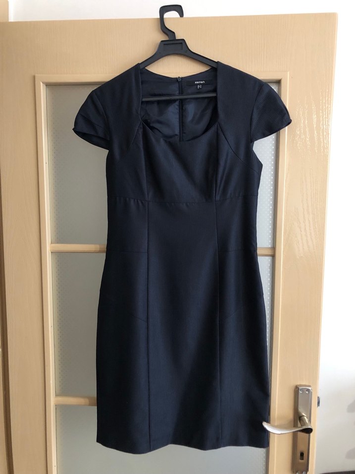 Siyah antrasit, U yakalı, kısa kollu, drapeli ve vücuda oturan midi elbise, klasik ve modern ofis şıklığı için uygundur.