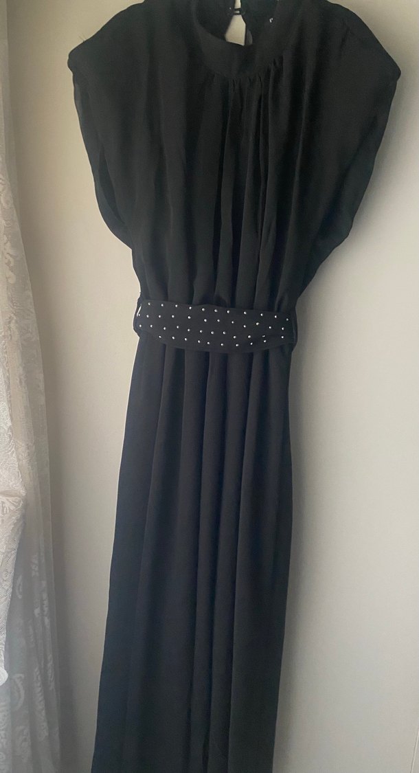 Yüksek yakalı ve drapeli detaylı siyah uzun elbise, taşlı kemer ve askılı kollara sahiptir. Moda tutkunları için şık bir seçim.