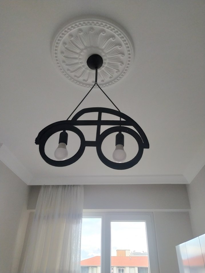 Siyah renkte, araba şeklinde tasarlanmış ve iki ampullü tavan lambasıdır.