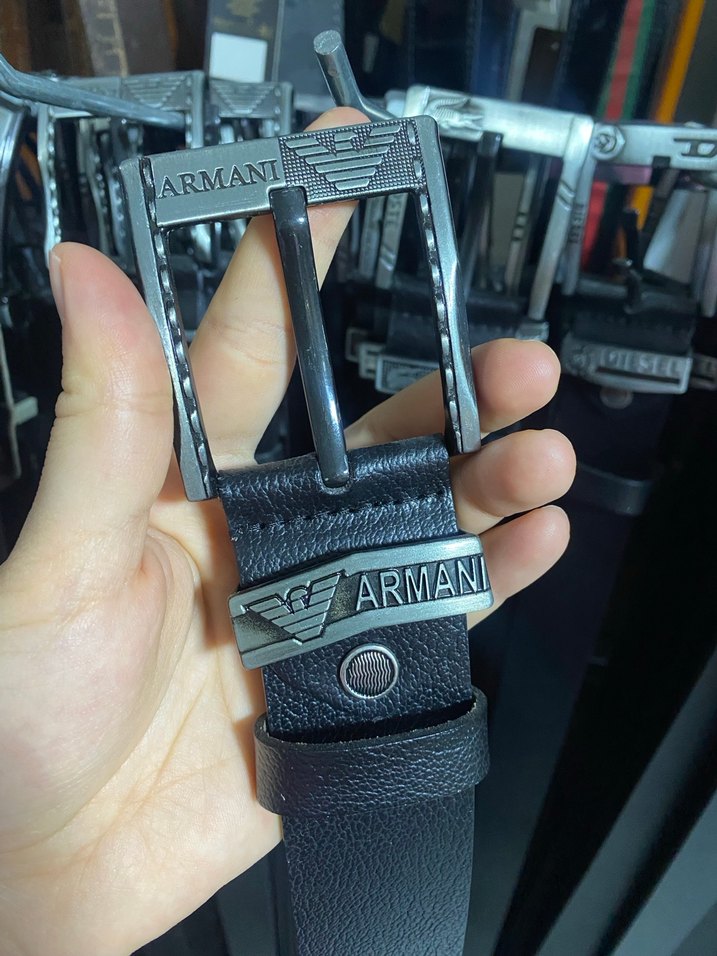 Armani logosu ve dokulu tokasıyla siyah erkek kemeri, sokak stiline uygun.