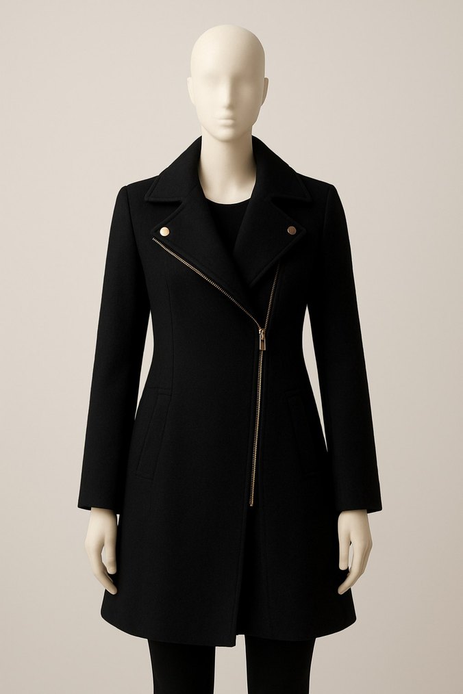 Siyah kumaştan asimetrik fermuarlı, kadınlar için şık ve modern görünümlü bir kaban.