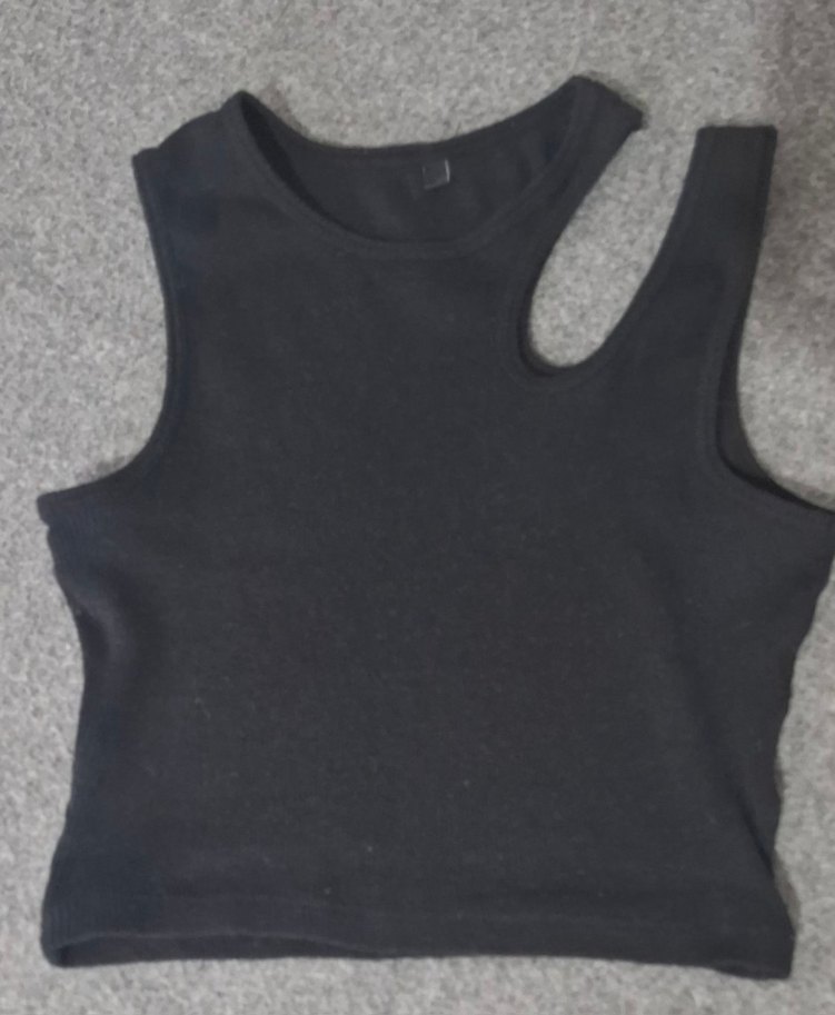 Siyah, asimetrik yakalı, vücuda oturan kolsuz crop top. Yumuşak sentetik kumaştan, dış mekan için uygun.