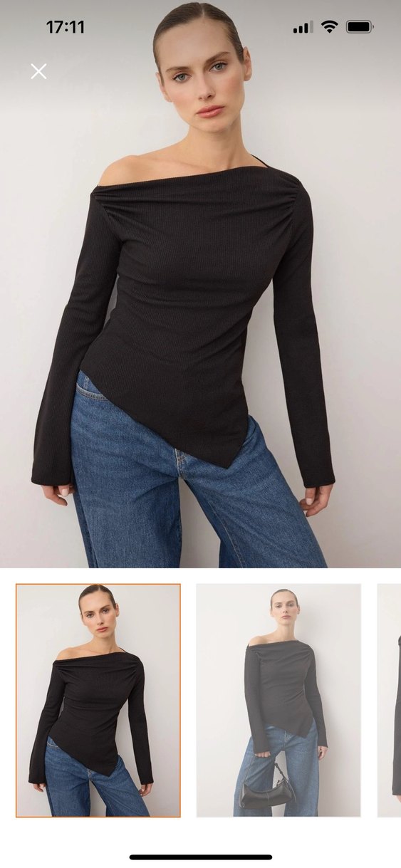 Geniş yakalı, uzun kollu siyah bluz, asimetrik kesim ve yırtmaç detayına sahip, rahat kesimiyle gündelik sokak stiline uygundur.