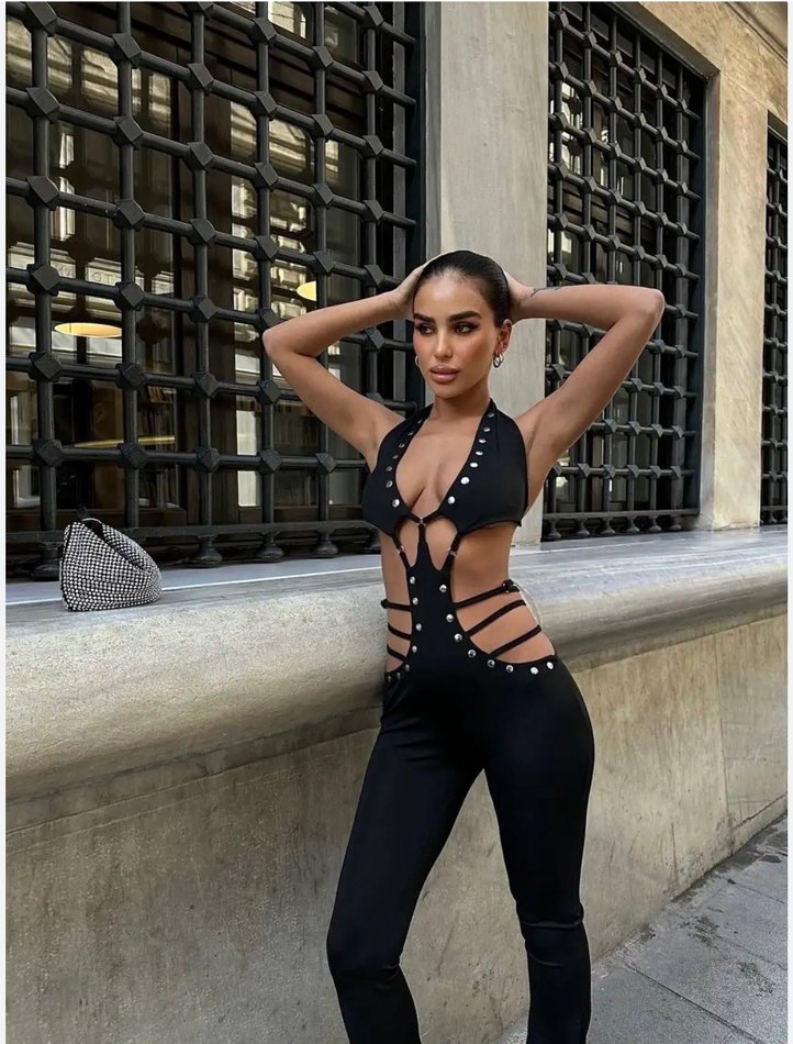 Siyah , askılı ve kemerli detaylara sahip, uzun ve vücuda oturan kadın tulumu, cesur sokak stili ve partiler için uygundur. S ve M uyumludur