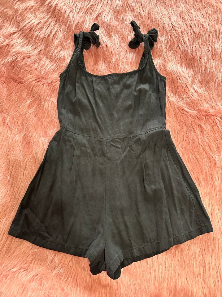 Kot kumaştan yapılmış, askılı ve siyah tulum, romantik akşamlar için uygundur.