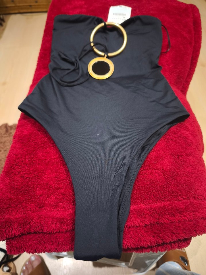 Siyah, askılı, kemer detaylı ve halka süslemeli, vücuda oturan kadın mayo, plajda kullanıma uygun.
