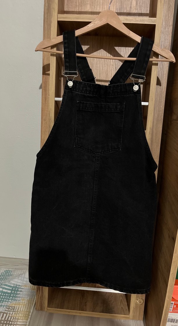 Siyah kot kumaştan, askılı ve tokalı kayışlara sahip, midi boyda, vücuda oturan günlük kullanıma uygun salopet. Yüksek yakalı ve ön cep detaylı.