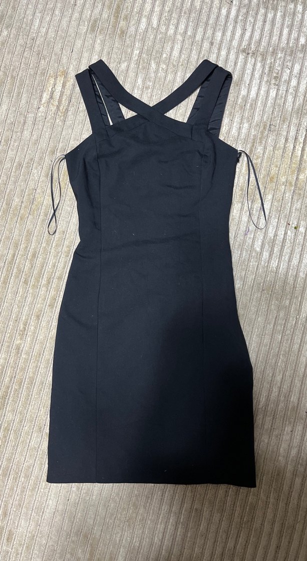 Siyah, askılı detaylara sahip, straplez kesim midi boy ve fit kesim elbise, minimalist goth tarzıyla günlük kullanıma uygun.