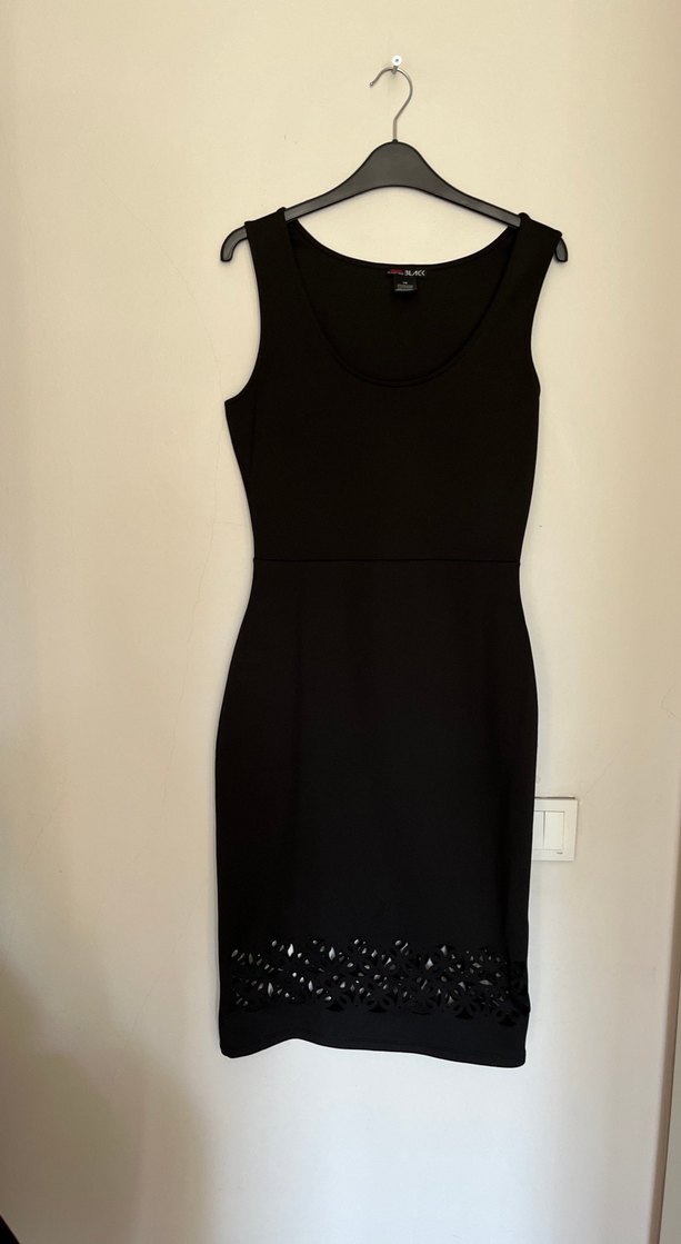 Kolsuz, v yaka ve bele oturan siyah midi elbise. Sentetik kumaştan üretilmiş, etek ucu detaylı kesim ve yırtmaçlı, romantik akşamlar için ideal.
