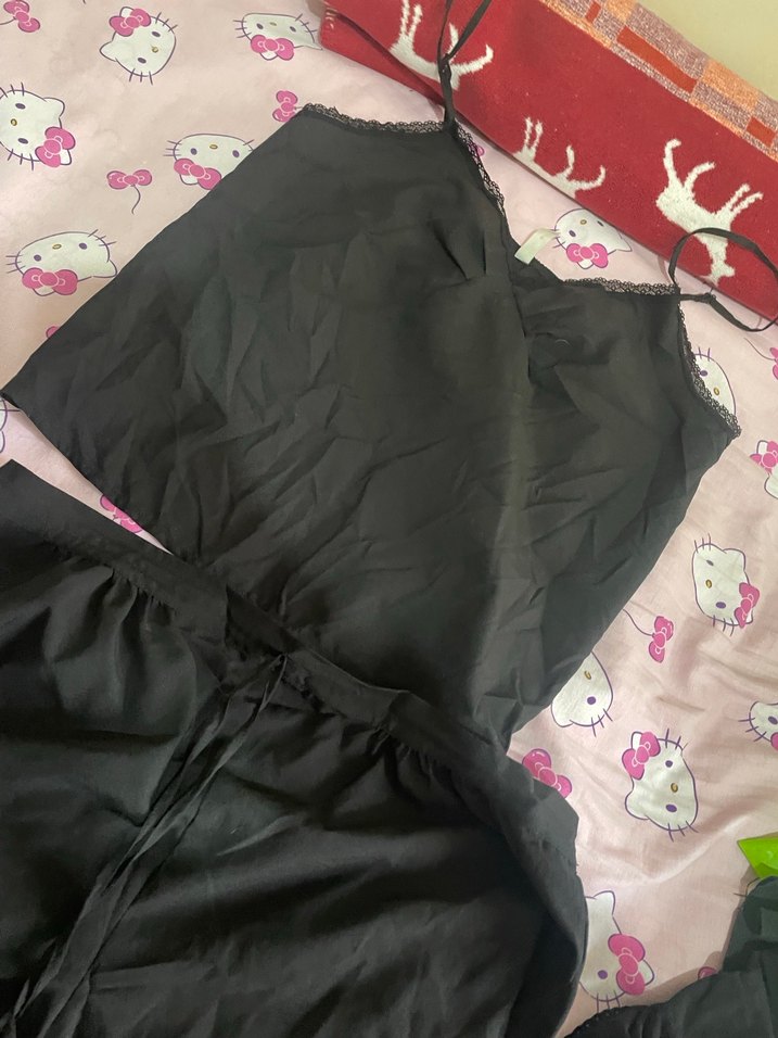 Siyah askılı, midi boy, bol kesim pijama takımı. Minimalist gotik tarzda, yumuşak kumaştan rahatlık sağlar.