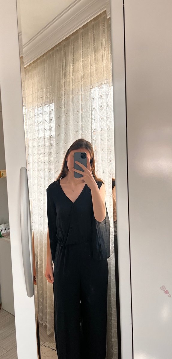 Siyah askılı, bol kesim ve kemerli bel detayına sahip ipeksi dokulu midi boy tulum, günlük kullanım için uygundur bacak kısmında astarı var iç göstermiyor kemeri çıkartılabiliyor s beden fakat bence m giyen birine de olur esnek bir kumaşa sahip boyum 171 kilom 54