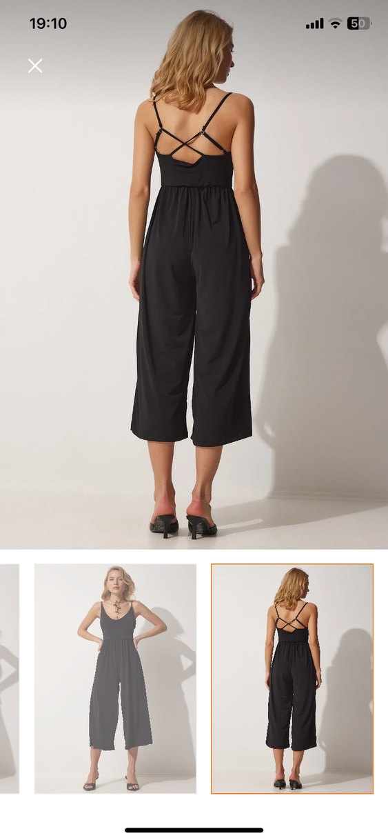 Siyah askılı, midi boy, bol kesim tulum. İpeksi kumaştan, minimal tasarımlı, günlük sokak stili için rahat ve şık. S xs uyumlu etiketli bir şekilde dolapta duruyor hiç giyilmedi