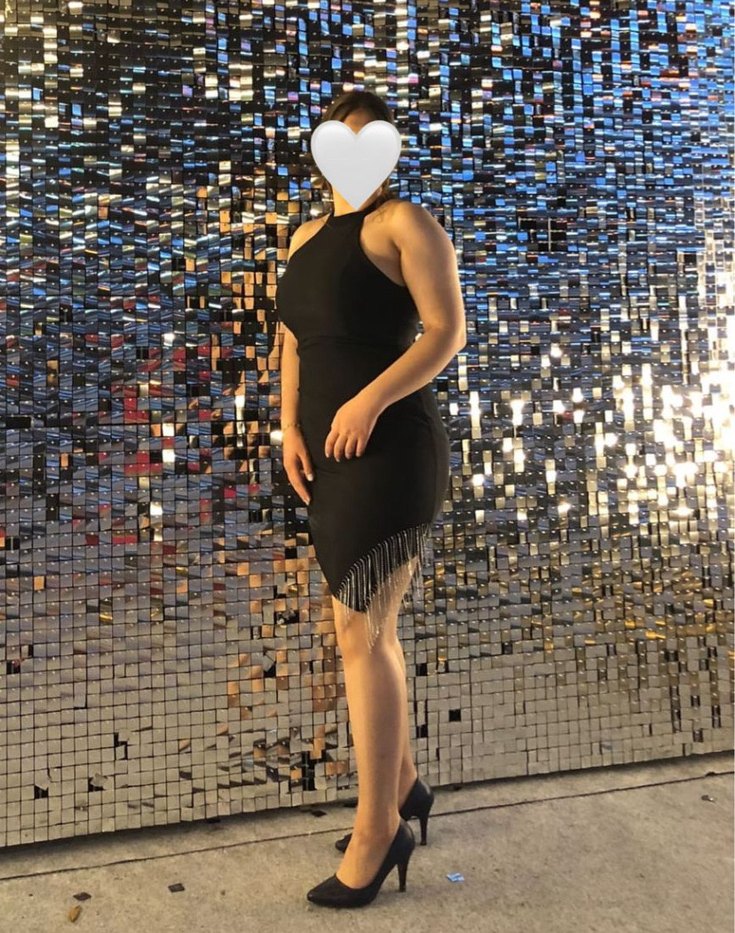 Siyah, yakalı ve ince askılı, vücuda oturan midi boy abiye elbise. Etek ucu payetli püsküllerle süslenmiştir.