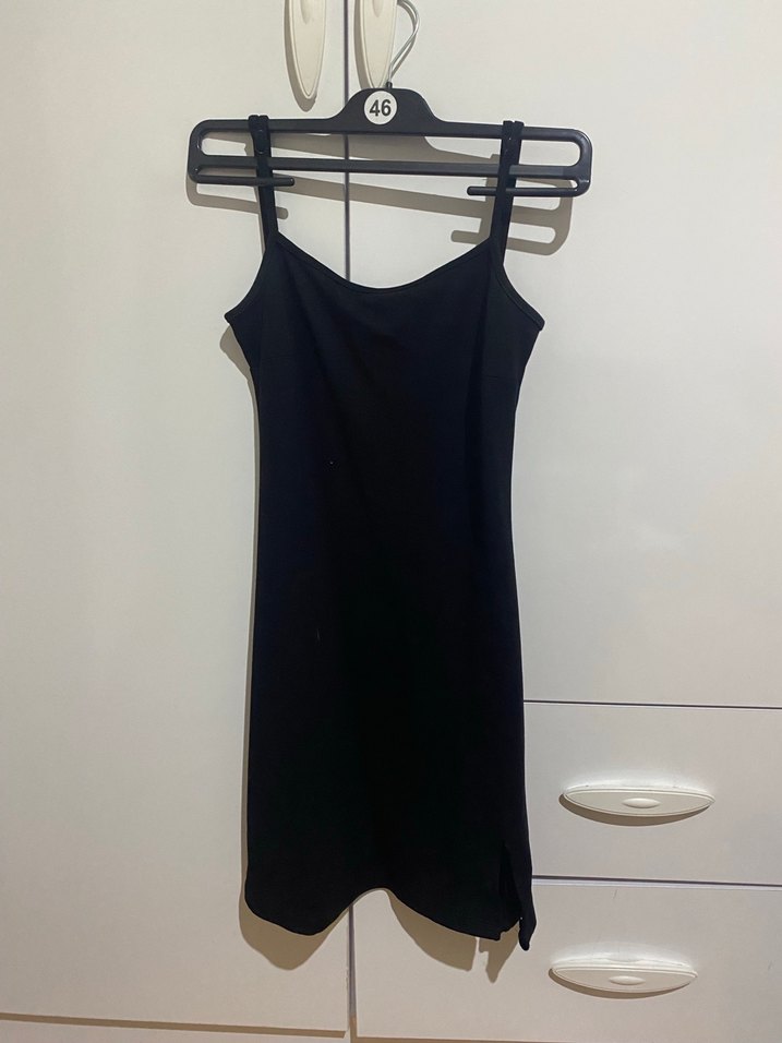 Siyah, ince askılı bu fitted midi elbise, minimalist gotik tarzıyla zahmetsiz şıklığı yansıtıyor. Günlük kullanım için cesur bir tercih.