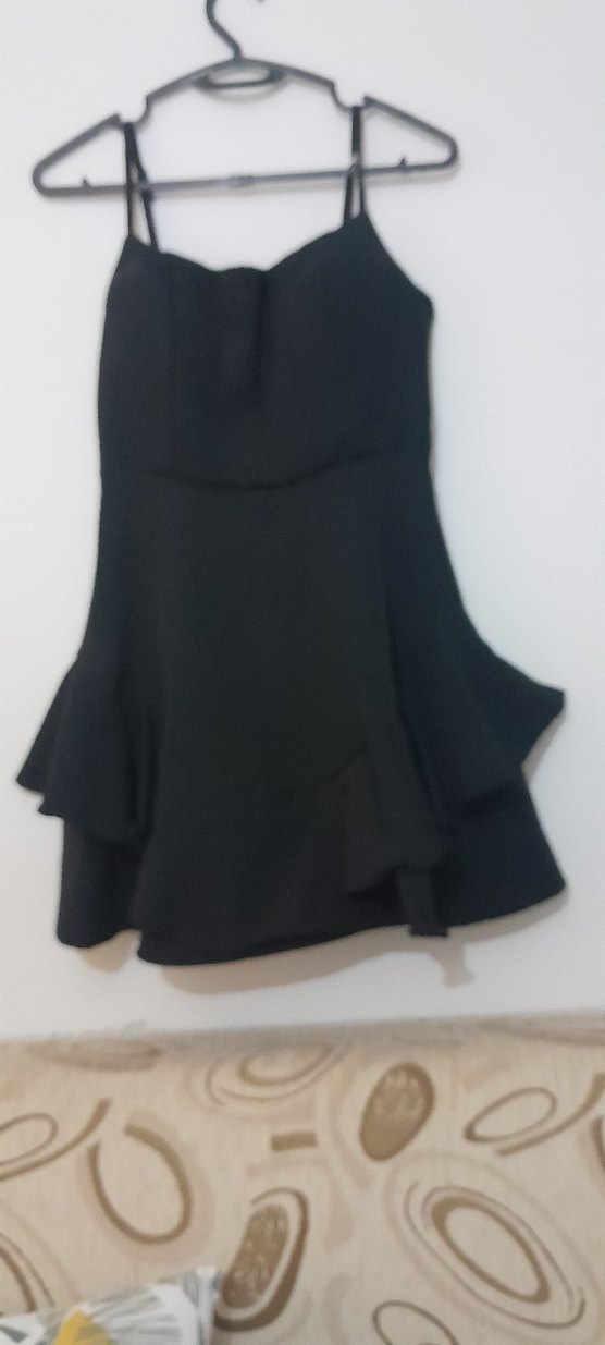 Siyah, askılı mini fırfırlı detaylı, vücuda oturan kadın elbisesi. Günlük kullanıma uygun, desensiz ve şık.