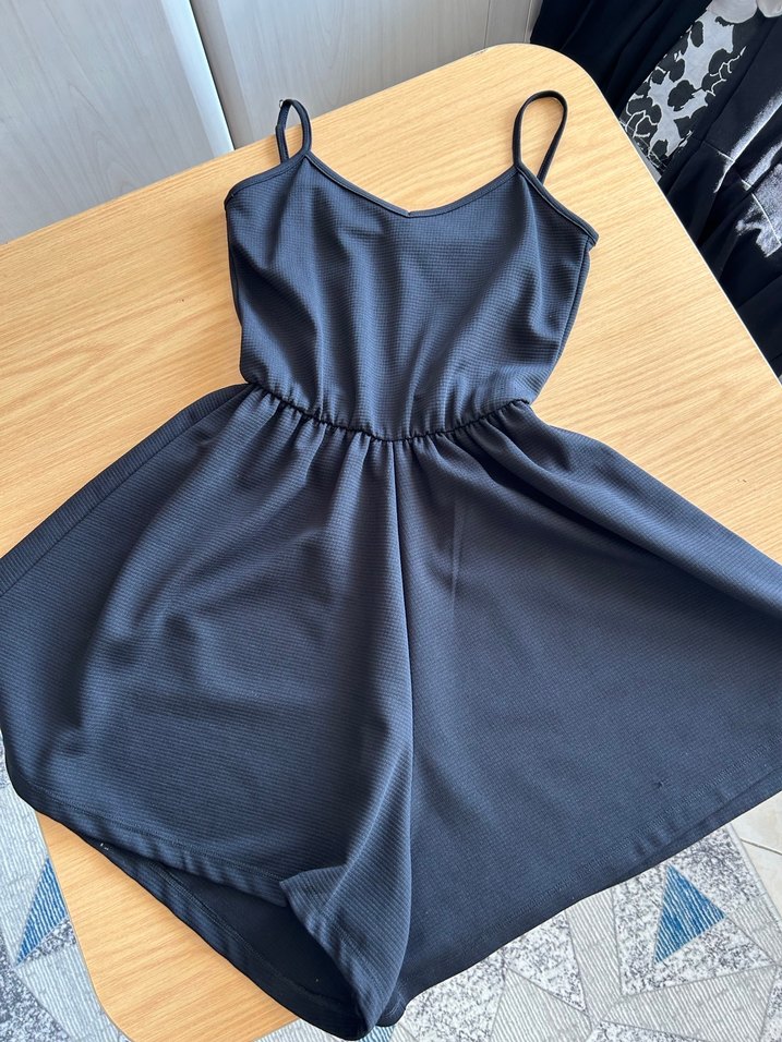 Siyah mini şort tulum, ince askılı ve V yakalıdır. Rahat kesimi ve drapeli tasarımıyla, yumuşak sentetik kumaştan üretilmiştir. ✨