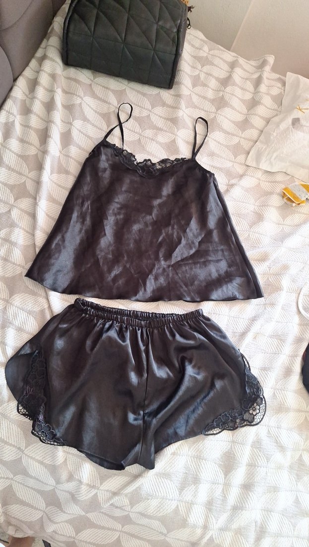 Siyah, askılı üst ve dantel detaylı şortlardan oluşan bol kesim mini pijama takımı, rahat ve koyu goth tarzı sunar.