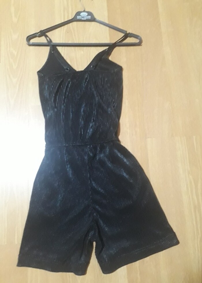 Siyah parlak kumaşlı mini,orta boy,S beden askılı şort tarzı tulum,topshow marka