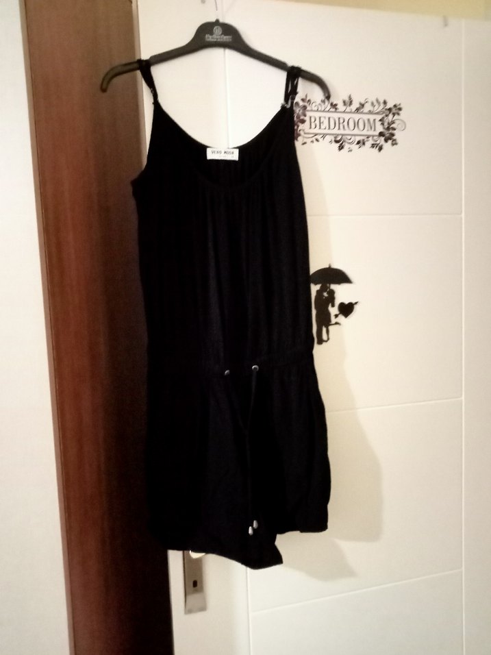 Siyah, askılı, mini uzunlukta ve belden kemerli, bol kesim tulum. İpeksi kumaştan, bohem ve retro tarzına uygun günlük kullanım için.