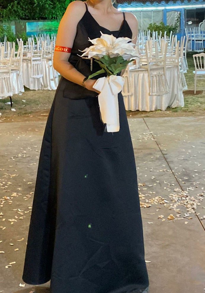 Siyah, uzun kadın abiyesi, drapeli tasarımı ve askılıdır. Sadece bir kez giyildi. Göğüs bölümünde işlem yapıldı ilgilenenlere fotograf atılır.