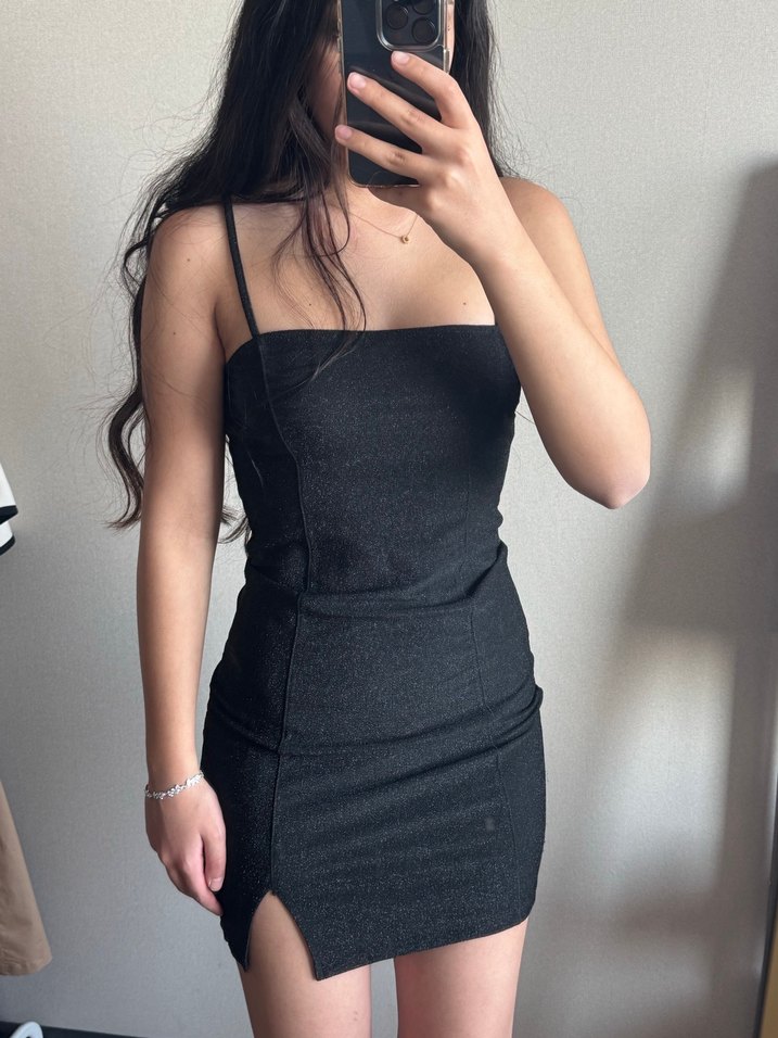 Siyah askılı simli elbise, ince askılı ve vücuda oturan kesimle.