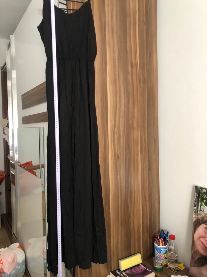 Siyah askılı uzun elbise, yan yırtmaçlı ve bol kesimlidir. Yumuşak sentetik kumaştan yapılmıştır, minimalist ve şık bir görünüm sunar.