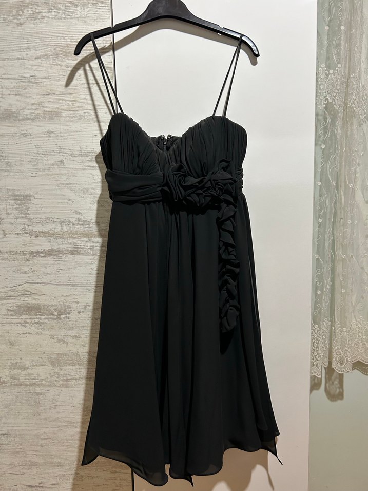 Siyah, ince askılı ve straplez yaka detaylı, drapeli, uzun ve dar kesim gotik abiye elbise. Düğün için uygundur. Ön kısmında hafif beyazlık var belki yıkayınca geçebilir