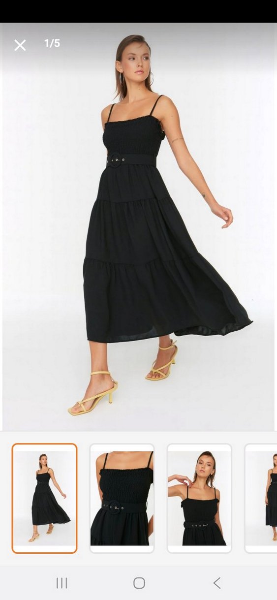 Siyah askılı uzun elbise, kemerli ve ince askılıdır. Düz, sentetik kumaştan yapılmıştır. Straplez yakaya ve regular kesime sahiptir.