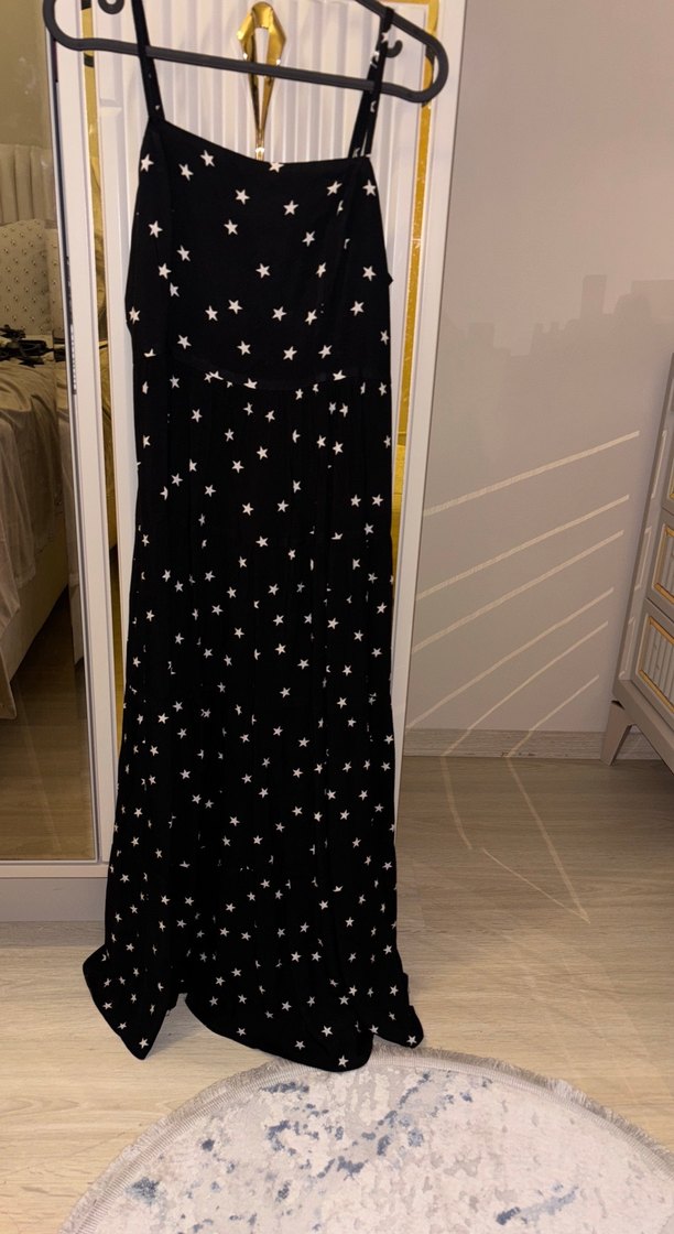 Siyah, ayarlanabilir askılı uzun elbise, salaş kesim ve yıldız desenli, drapeli detaylarla bohem bir tarz sunar. Midi boydur.