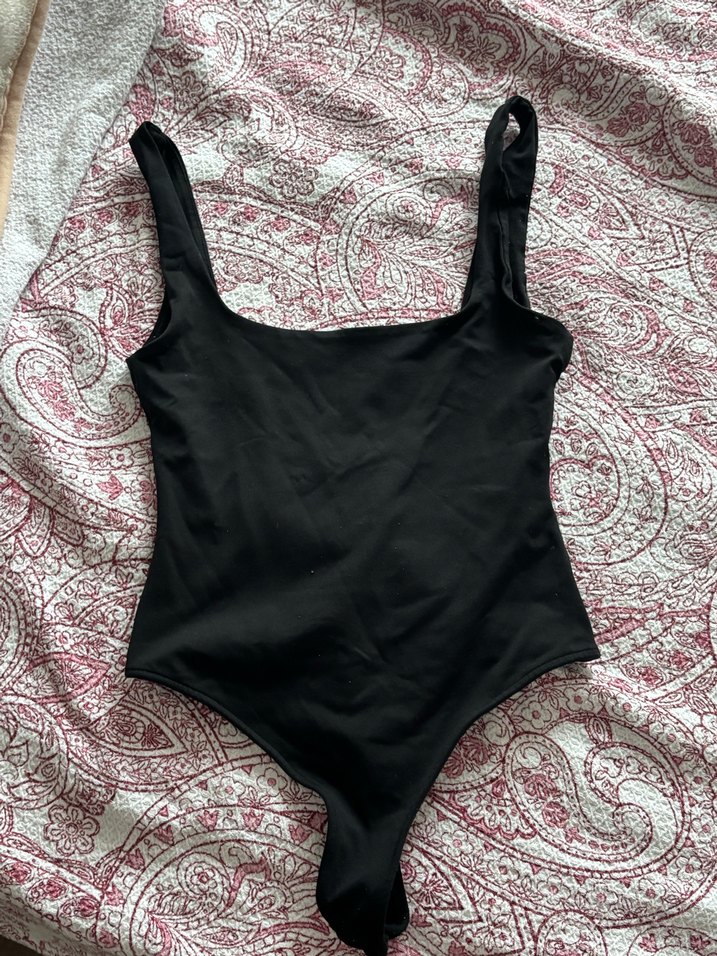 Vücuda oturan, siyah renk kadın bodysuit, askılı kolları ve midi boyu ile günlük kullanıma uygun, cesur ve şık bir sokak stili, ikinci el
