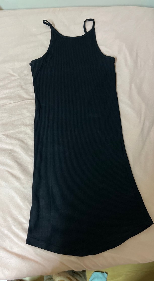 Askılı yüksek yakalı ve siyah uzun elbise, düz ve şık bir görünüm için yumuşak sentetik kumaştan yapılmıştır. Günlük kullanım için uygundur.