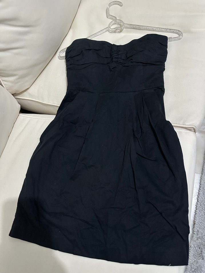 Siyah askısız gece elbisesi, drapeli detaylar ve vücuda oturan kesimiyle romantik gece için minimalist ve iddialı bir seçim. Yanlarda cepleri var