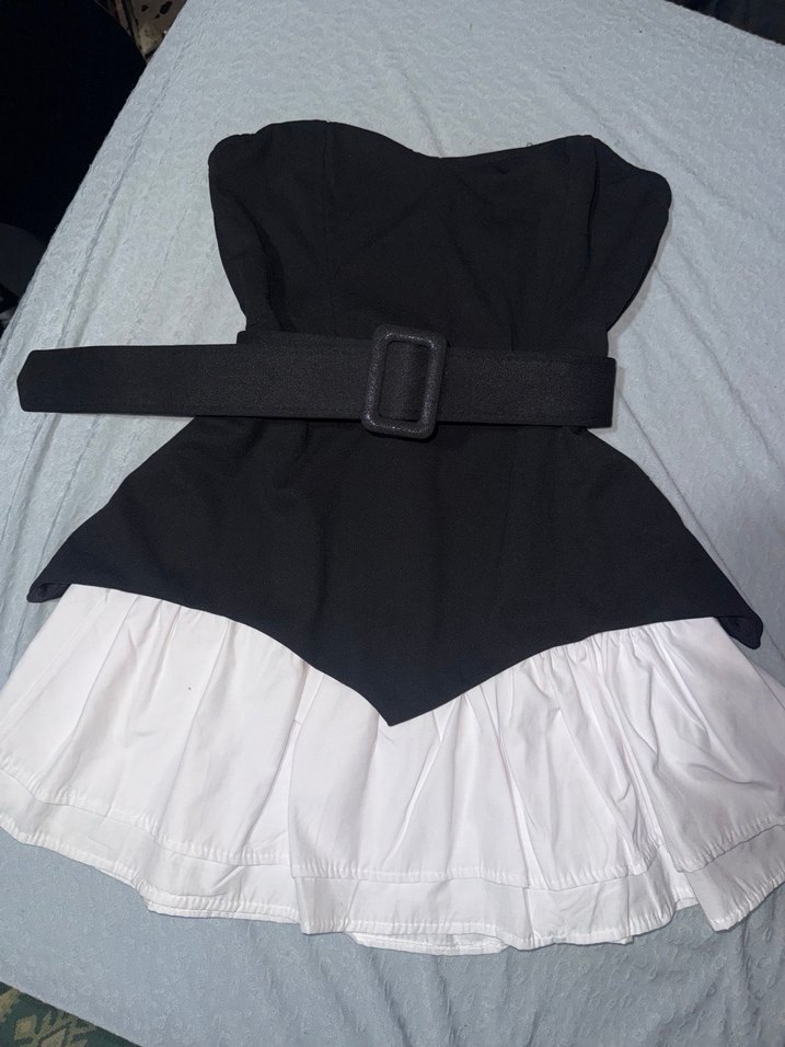 Kemersiz olarak verilecek askısız, siyah mini elbise, beyaz katmanlı etek ile gotik parti stiline uygun.