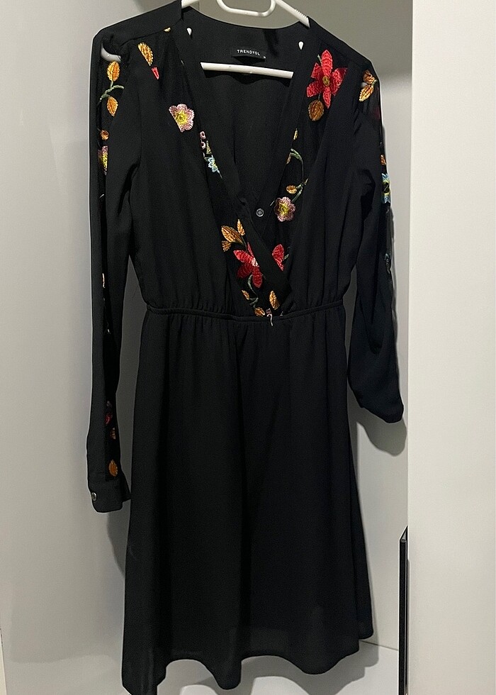 Siyah astarlı şifon kolları çiçekli transparan detaylı belden lastikli hiç kullanılmamış elbise