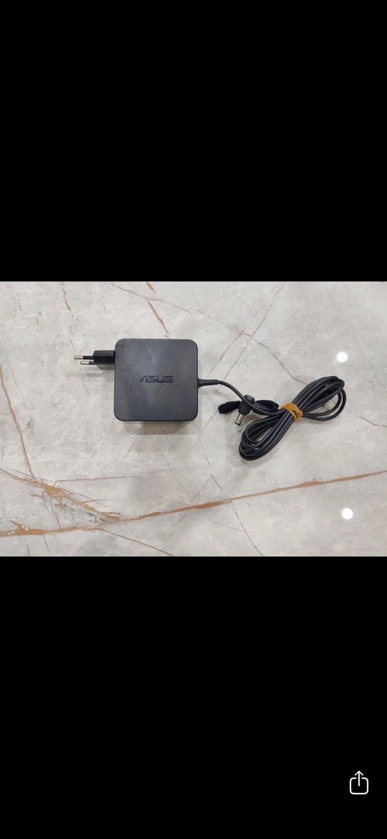 ASUS marka siyah şarj adaptörü, kompakt tasarımlı ve kablolu yapısıyla kolay şarj imkanı sunar.