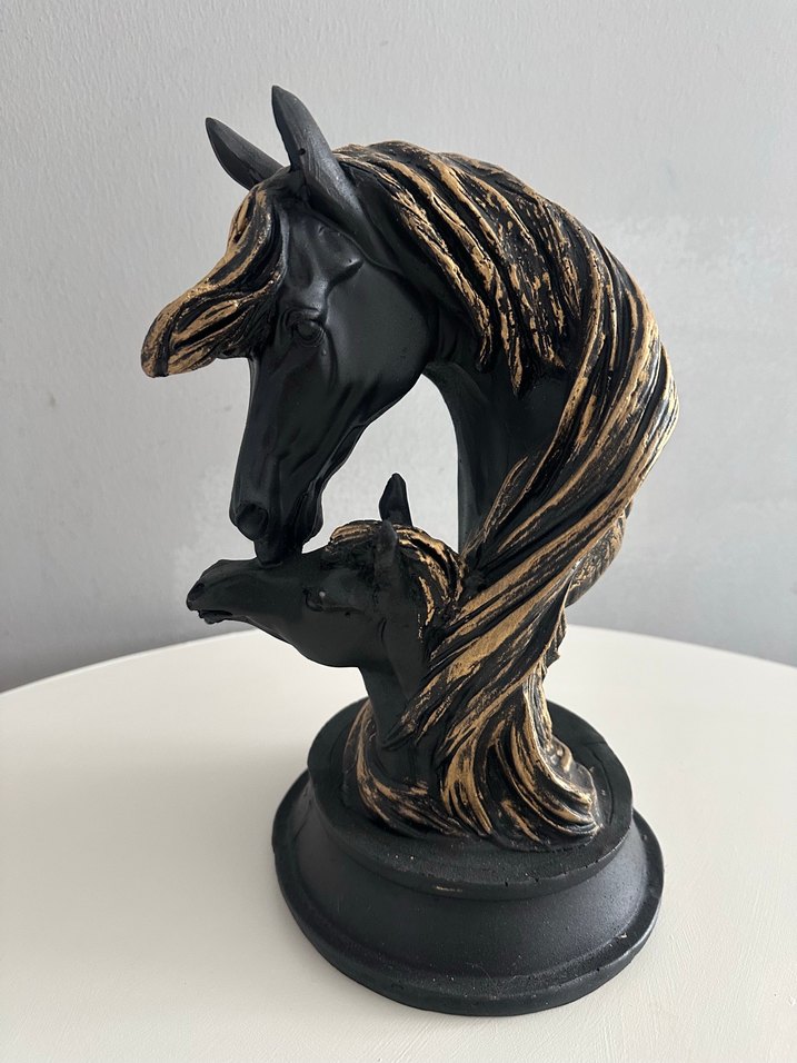 Altın tonlarında detaylı yeleleri olan iki at figüründen oluşan siyah renkte, yuvarlak tabanlı dekoratif obje.