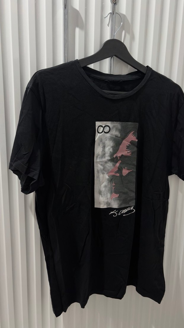 Pamuk siyah kısa kollu erkek tişört, bol kesim ve önünde baskılı grafik bulunur. Yuvarlak yakalı, sokak stili tasarım.