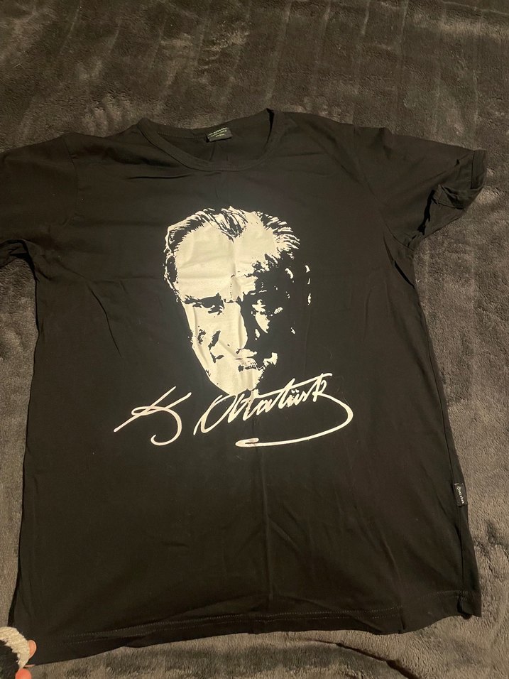 Siyah, baskılı, kısa kollu ve yuvarlak yakalı Atatürk tişörtü. Rahat kesimli ve ipeksi dokulu, günlük kullanım için uygun.