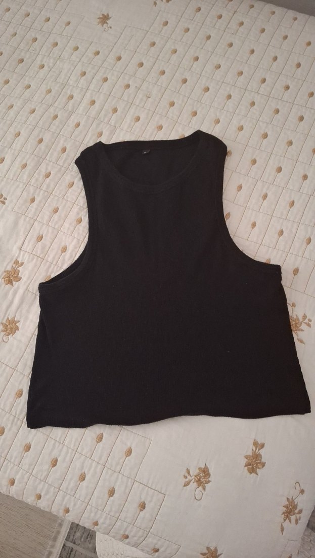 Siyah, salaş kesim, bisiklet yakalı, sentetik kumaştan üretilmiş spor için uygun sade ve şık atlet.