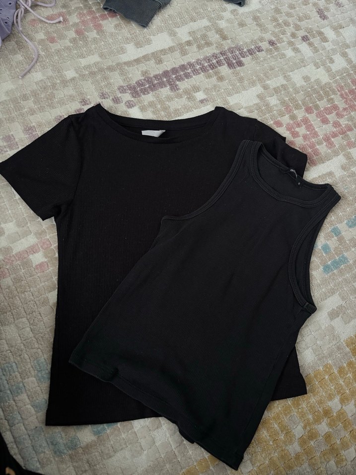Yumuşak ve rahat kumaştan yapılmış siyah kısa kollu tişört ve kolsuz atletinden oluşan set.