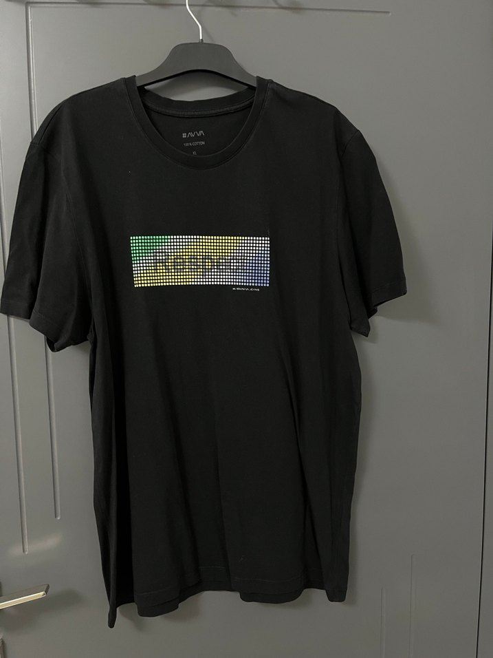 Siyah AVVA erkek tişört, yuvarlak yaka ve kısa kollu, %100 pamuktan üretilmiştir. Gevşek kesim, baskılı ve düğmeli detaylıdır, günlük sokak stili için uygundur.