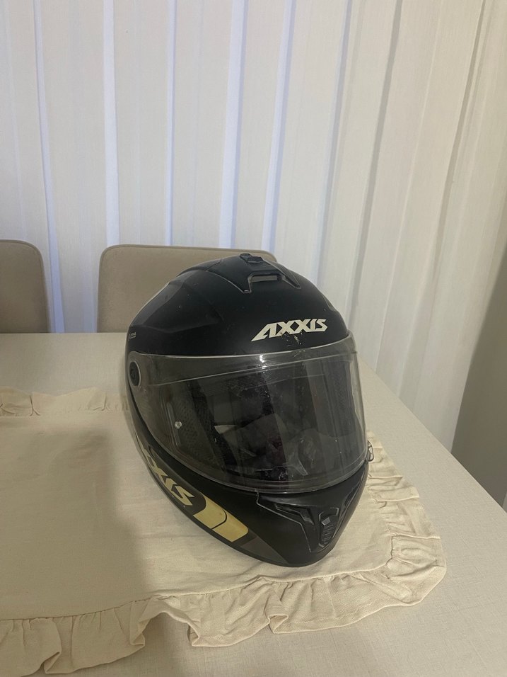 Siyah Axxis baskılı motosiklet kaskı, tokalı kayış ve dayanıklı plastikten yapılmıştır. Şeffaf vizöre ve rock punk tarzında minimalist görünüme sahiptir. ️