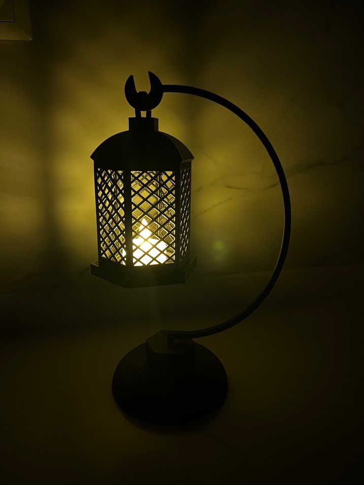 Kavisli ayaklı siyah metal fener mumluk, karanlık ortamlarda sıcak bir ışık saçar. ️