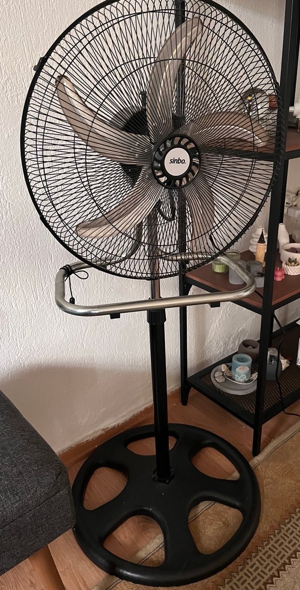 Siyah ayaklı vantilatör, koruyucu ızgaralı ve ayarlanabilir yükseklikte. Dayanıklı taban ve taşıma kolu bulunur. Pazarlık yapılır