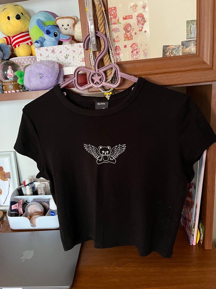 Berahka kısa tişört iyi durumda Yumuşak kumaştan, kanatlı ayı baskılı, fitted kesim siyah kısa kollu tişört, günlük kullanım için goth ve punk tarzında.