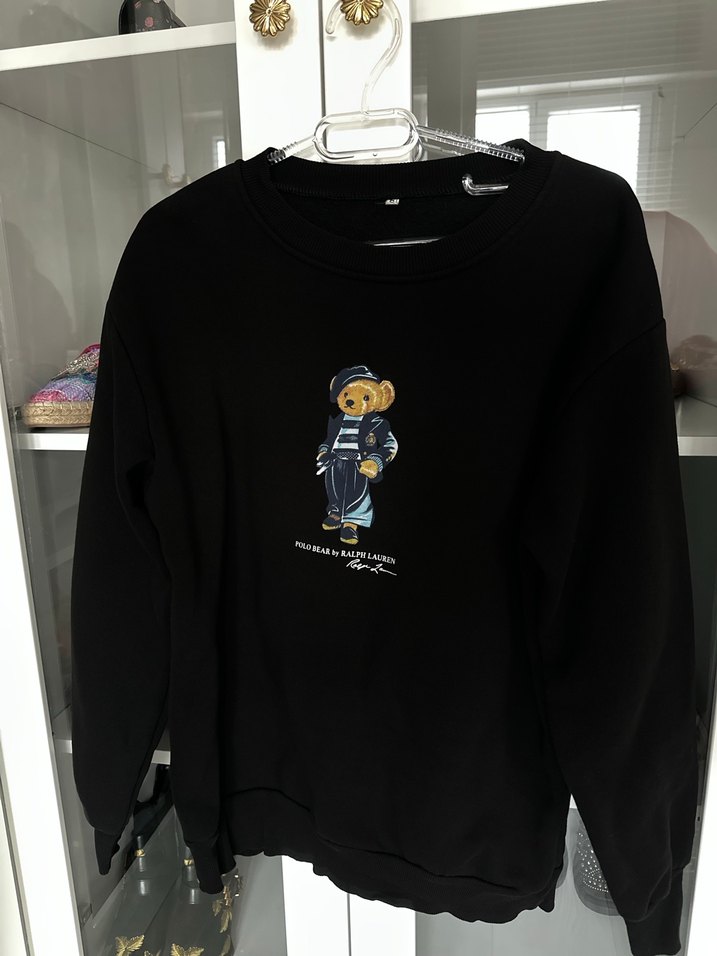 Uzun kollu, yuvarlak yaka ve oversize kesime sahip siyah sweatshirt, baskılı ayıcık deseni ile. Yumuşak ve sıcak kumaştan yapılmıştır, günlük kullanıma uygundur.