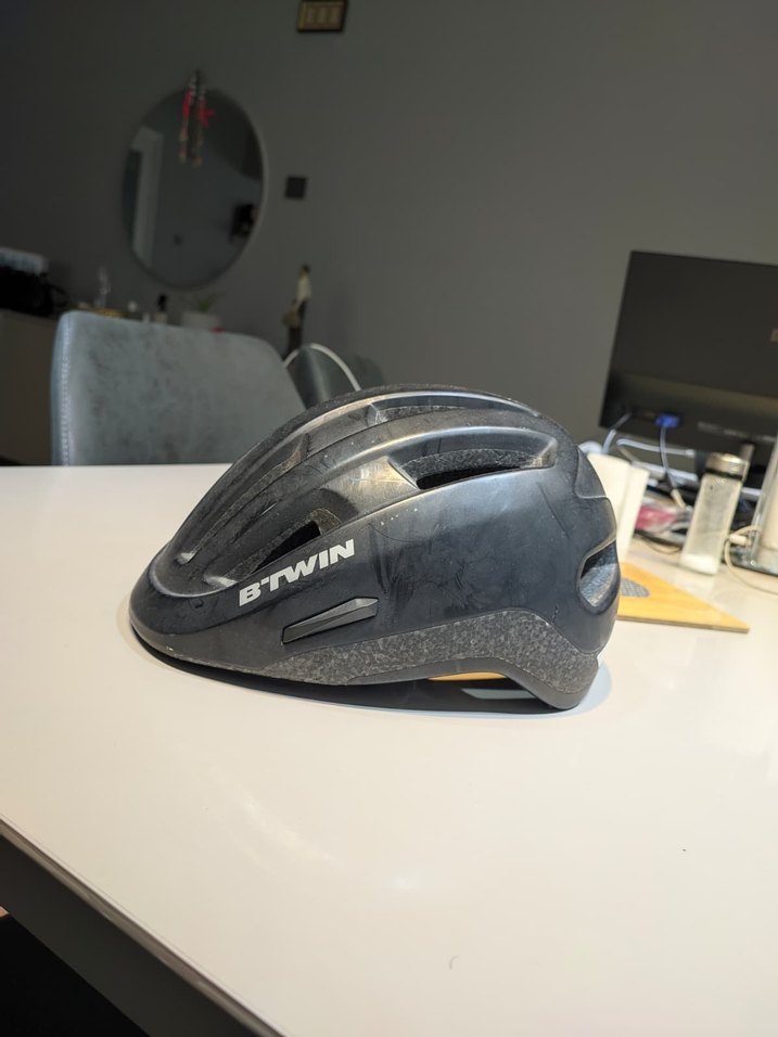 Siyah B'Twin marka, baskılı desenli, velcro bantlı, dayanıklı kauçuk malzemeden üretilmiş biker tarzı bisiklet kaskı. ️