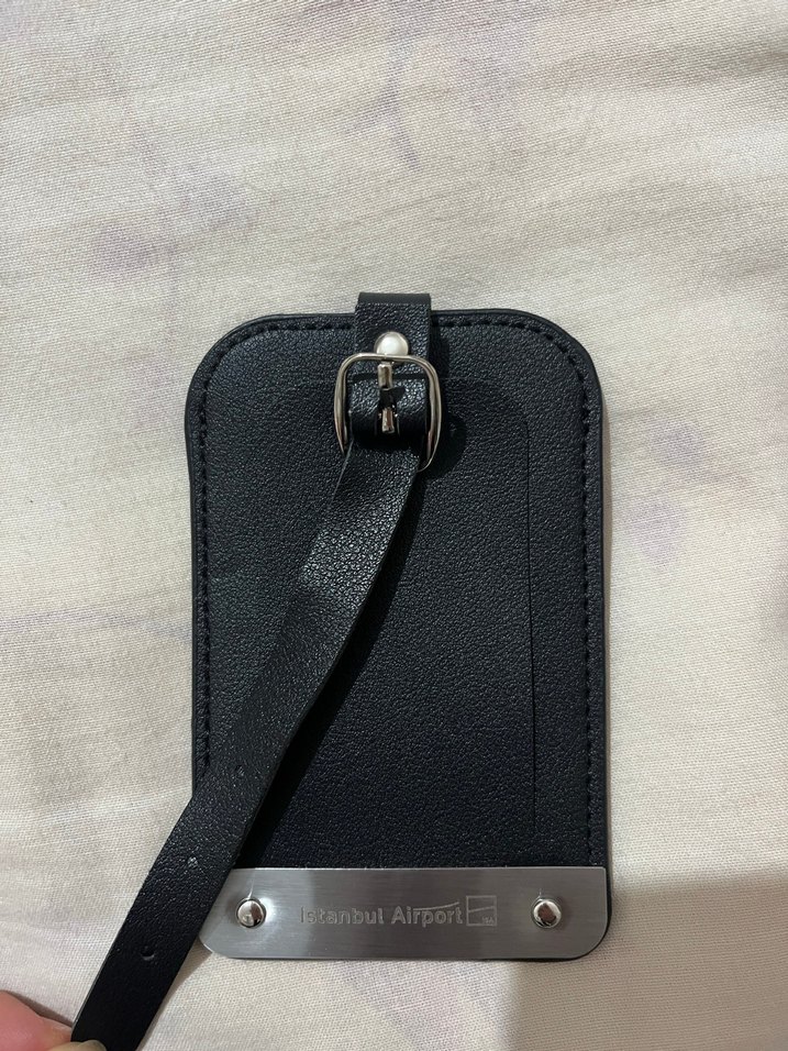 Kemer tokalı kayışa ve "Istanbul Airport" yazılı metal plakaya sahip siyah bagaj etiketi. Minimalist ve düz tasarım.
